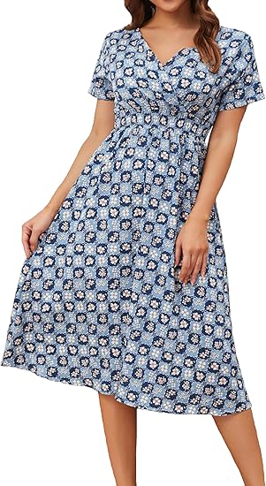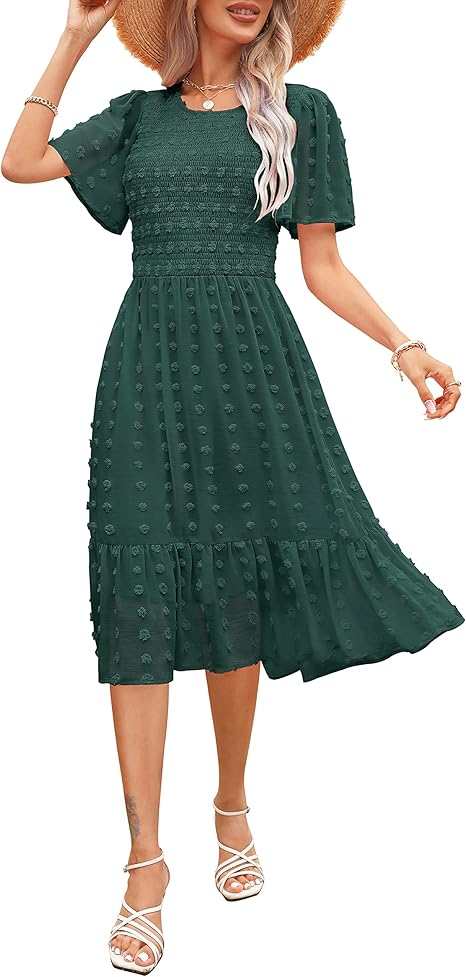 Women 2024 Summer Fall Wedding Guest Round Neck Flutter Short Sleeve Swing Flowy Tiered Smocked Swiss Dot Midi Dress