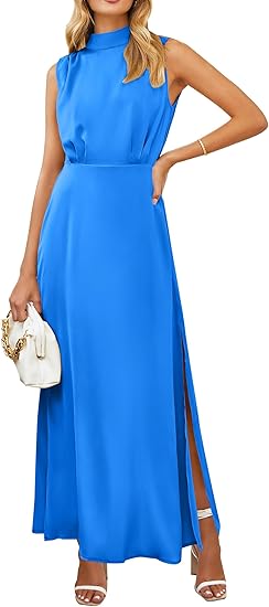 Women's Long Formal Satin Dress Mock Neck Sleeveless Side Slit Flowy Maxi Tank Dresses