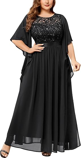 Women's Plus Size Sequin Lace with Ruffle Cape Cloak Sleeves Elegant Evening Wedding Party Maxi Dress