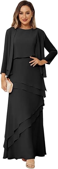Women’s 2 Pieces Chiffon Mother of The Bride Dress with Long Sleeve Jacket Long Formal Dress with Ruffles LN18