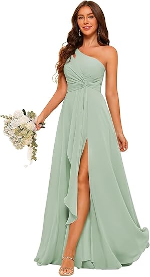 Chiffon One Shoulder Bridesmaid Dress with Pleated Bodice Long A Line Formal Dresses for Women AD004