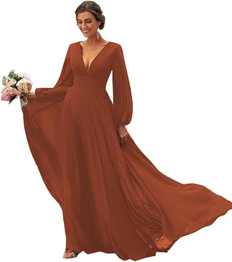 Women's Long Sleeves Bridesmaid Dresses V-Neck Chiffon A Line Formal Dress Evening Gowns with Train