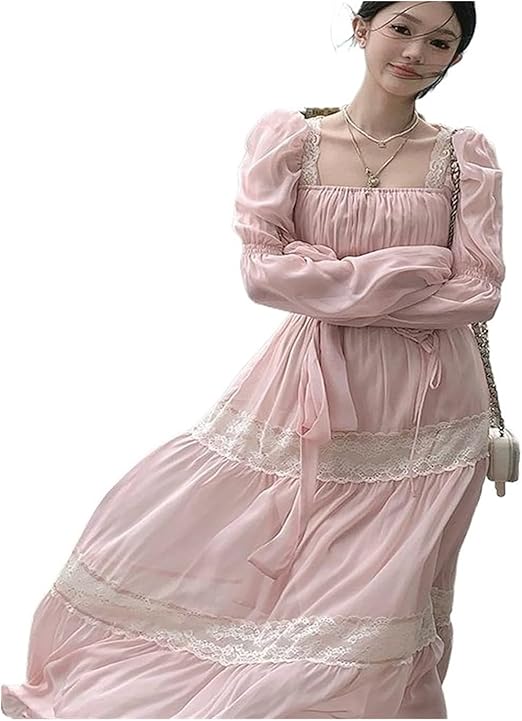 Casual Dress for Women French Lace Square Neck Fairy Dress Waist Thin Chiffon Long Skirt Beach Dresses