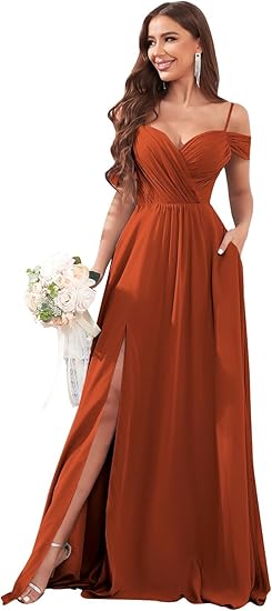 Off The Shoulder Bridesmaid Dresses for Women with Pockets Split Long Chiffon Formal Evening Dresses