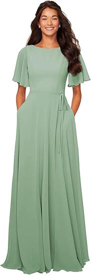 Chiffon Modest Bridesmaid Dresses A Line Bateau Neck Flutter Sleeve Formal Evening Gown with Pockets