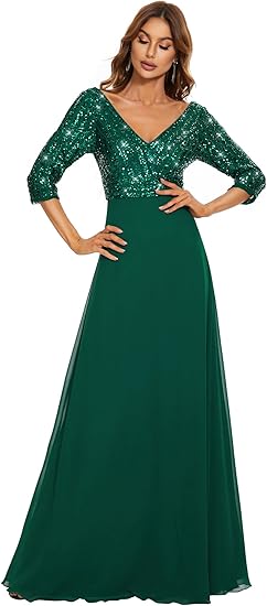 Women's Elegant Formal Dress V-Neck Long Sleeve Sequin Maxi Chiffon Evening Dresses 00751