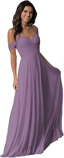 Off Shoulder Long Bridesmaid Dresses 2024 with PocketsChiffon A Line Formal Dress for Women Wedding MD1201