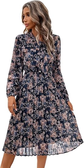 Work Dresses for Women 2023 Long Sleeves Chiffon Black Dress Retro Pleated Buttons Down Bow Tie Loose Causal Dresses