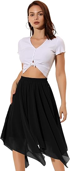 Women's Asymmetrical Hem Elastic Waist Chiffon Flowy Vintage Handkerchief Hemline Midi Skirt