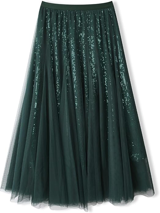 Sequin Long Tulle Skirt Layered Flowy Fairy Sparkle Party Mesh Tea Length Big Hem Skirts for Women