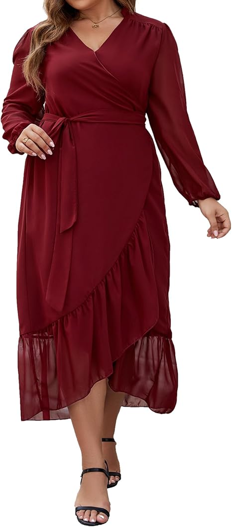 Plus Size Dresses for Women Wrap Tie Side Midi Dress Long Sleeve A Line Ruffle Hem Flowy Chiffon Dress